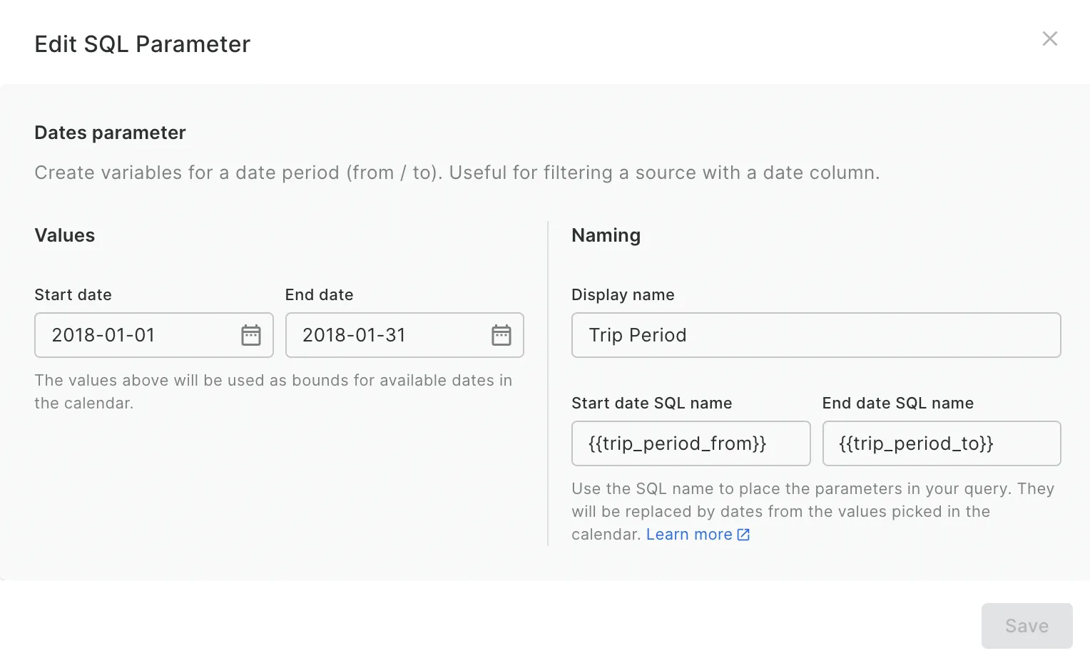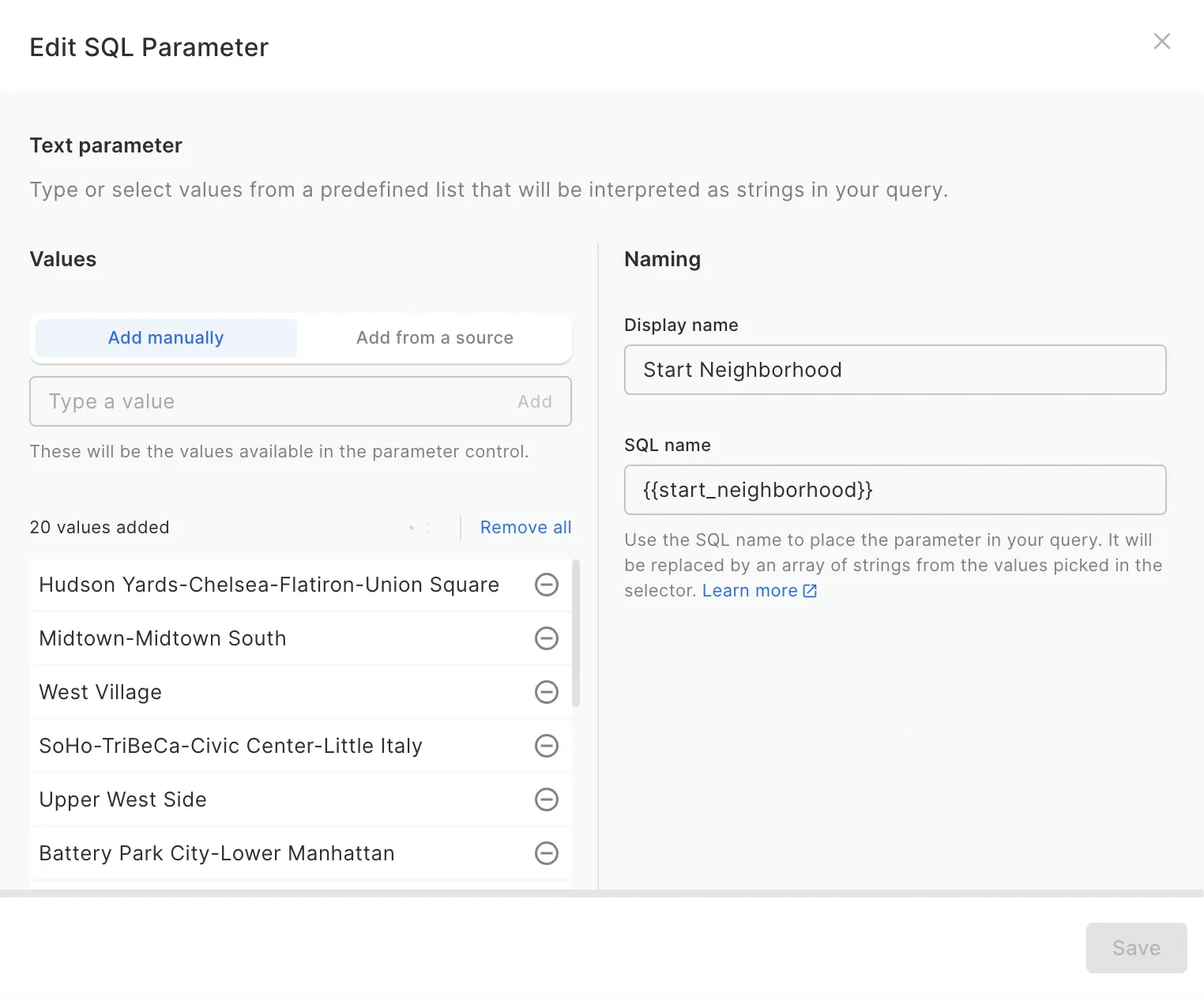 - In the sources panel, clickCreate a SQL Parameter.- Select the type of parameter you require. The options are date, numeric and string.- In the next window, choose a display name. This will generate a placeholder to use in your SQL query, such as {{start_date}}. - In the same window, select the values which the user will be able to choose from to be used in this parameter. You can enter them manually, or automatically generate them from a data source.