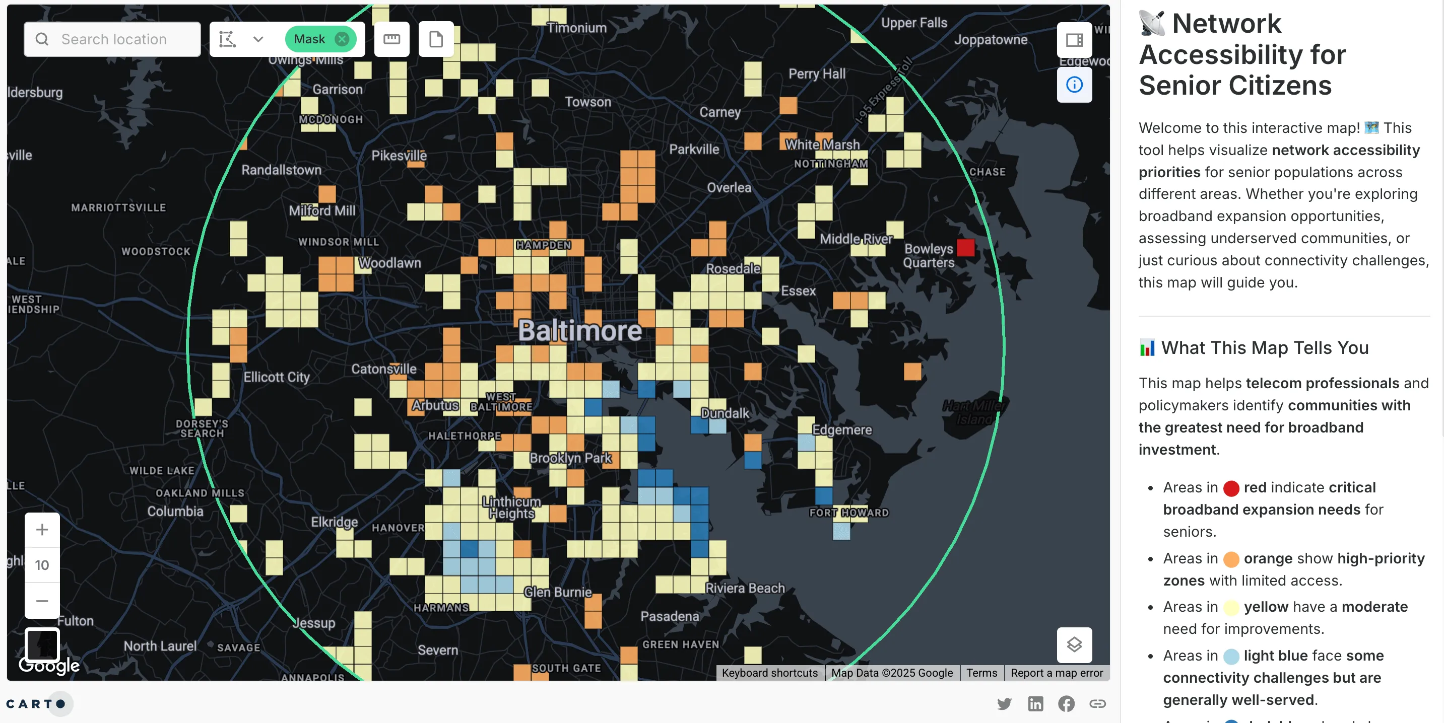 [](https://clausa.app.carto.com/map/d0d68925-2206-4f93-8da7-1a0fb8a05466?zoom=10&lat=39.284455&lng=-76.623775&mask=POLYGON+%28%28-76.600661+39.478546%2C+-76.625537+39.4776%2C+-76.650172+39.474771%2C+-76.674326+39.470087%2C+-76.697765+39.463594%2C+-76.720261+39.455353%2C+-76.741597+39.445446%2C+-76.761567+39.433968%2C+-76.779976+39.421031%2C+-76.796649+39.40676%2C+-76.811424+39.391293%2C+-76.82416+39.37478%2C+-76.834735+39.35738%2C+-76.843048+39.339262%2C+-76.849022+39.320601%2C+-76.852599+39.301577%2C+-76.853749+39.282373%2C+-76.852461+39.263174%2C+-76.848751+39.244166%2C+-76.842655+39.22553%2C+-76.834234+39.207446%2C+-76.823571+39.190088%2C+-76.81077+39.173622%2C+-76.795955+39.158207%2C+-76.779269+39.143989%2C+-76.760872+39.131105%2C+-76.740943+39.119679%2C+-76.719673+39.109819%2C+-76.697264+39.10162%2C+-76.673933+39.09516%2C+-76.649901+39.090502%2C+-76.625399+39.087689%2C+-76.600661+39.086748%2C+-76.575922+39.087689%2C+-76.55142+39.090502%2C+-76.527389+39.09516%2C+-76.504057+39.10162%2C+-76.481649+39.109819%2C+-76.460378+39.119679%2C+-76.440449+39.131105%2C+-76.422053+39.143989%2C+-76.405367+39.158207%2C+-76.390552+39.173622%2C+-76.37775+39.190088%2C+-76.367087+39.207446%2C+-76.358667+39.22553%2C+-76.352571+39.244166%2C+-76.34886+39.263174%2C+-76.347572+39.282373%2C+-76.348722+39.301577%2C+-76.3523+39.320601%2C+-76.358273+39.339262%2C+-76.366587+39.35738%2C+-76.377162+39.37478%2C+-76.389898+39.391293%2C+-76.404673+39.40676%2C+-76.421345+39.421031%2C+-76.439755+39.433968%2C+-76.459724+39.445446%2C+-76.48106+39.455353%2C+-76.503557+39.463594%2C+-76.526995+39.470087%2C+-76.55115+39.474771%2C+-76.575784+39.4776%2C+-76.600661+39.478546%29%29) ## Accessible and Actionable Data InsightsDashboards like these do more than present information—they empower action. Even with a synthetic accessibility score, disparities are clear: rural areas lag behind urban centers. By integrating CAF II overlays, we can pinpoint where funding can have the greatest impact.