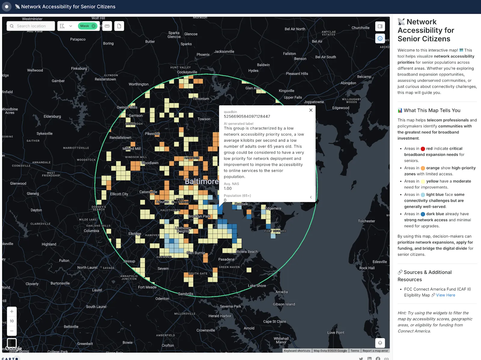 [](https://clausa.app.carto.com/map/d0d68925-2206-4f93-8da7-1a0fb8a05466?zoom=10&lat=39.284455&lng=-76.623775&mask=POLYGON+%28%28-76.600661+39.478546%2C+-76.625537+39.4776%2C+-76.650172+39.474771%2C+-76.674326+39.470087%2C+-76.697765+39.463594%2C+-76.720261+39.455353%2C+-76.741597+39.445446%2C+-76.761567+39.433968%2C+-76.779976+39.421031%2C+-76.796649+39.40676%2C+-76.811424+39.391293%2C+-76.82416+39.37478%2C+-76.834735+39.35738%2C+-76.843048+39.339262%2C+-76.849022+39.320601%2C+-76.852599+39.301577%2C+-76.853749+39.282373%2C+-76.852461+39.263174%2C+-76.848751+39.244166%2C+-76.842655+39.22553%2C+-76.834234+39.207446%2C+-76.823571+39.190088%2C+-76.81077+39.173622%2C+-76.795955+39.158207%2C+-76.779269+39.143989%2C+-76.760872+39.131105%2C+-76.740943+39.119679%2C+-76.719673+39.109819%2C+-76.697264+39.10162%2C+-76.673933+39.09516%2C+-76.649901+39.090502%2C+-76.625399+39.087689%2C+-76.600661+39.086748%2C+-76.575922+39.087689%2C+-76.55142+39.090502%2C+-76.527389+39.09516%2C+-76.504057+39.10162%2C+-76.481649+39.109819%2C+-76.460378+39.119679%2C+-76.440449+39.131105%2C+-76.422053+39.143989%2C+-76.405367+39.158207%2C+-76.390552+39.173622%2C+-76.37775+39.190088%2C+-76.367087+39.207446%2C+-76.358667+39.22553%2C+-76.352571+39.244166%2C+-76.34886+39.263174%2C+-76.347572+39.282373%2C+-76.348722+39.301577%2C+-76.3523+39.320601%2C+-76.358273+39.339262%2C+-76.366587+39.35738%2C+-76.377162+39.37478%2C+-76.389898+39.391293%2C+-76.404673+39.40676%2C+-76.421345+39.421031%2C+-76.439755+39.433968%2C+-76.459724+39.445446%2C+-76.48106+39.455353%2C+-76.503557+39.463594%2C+-76.526995+39.470087%2C+-76.55115+39.474771%2C+-76.575784+39.4776%2C+-76.600661+39.478546%29%29) ## Accessible and Actionable Data InsightsDashboards like these do more than present information—they empower action. Even with a synthetic accessibility score, disparities are clear: rural areas lag behind urban centers. By integrating CAF II overlays, we can pinpoint where funding can have the greatest impact.