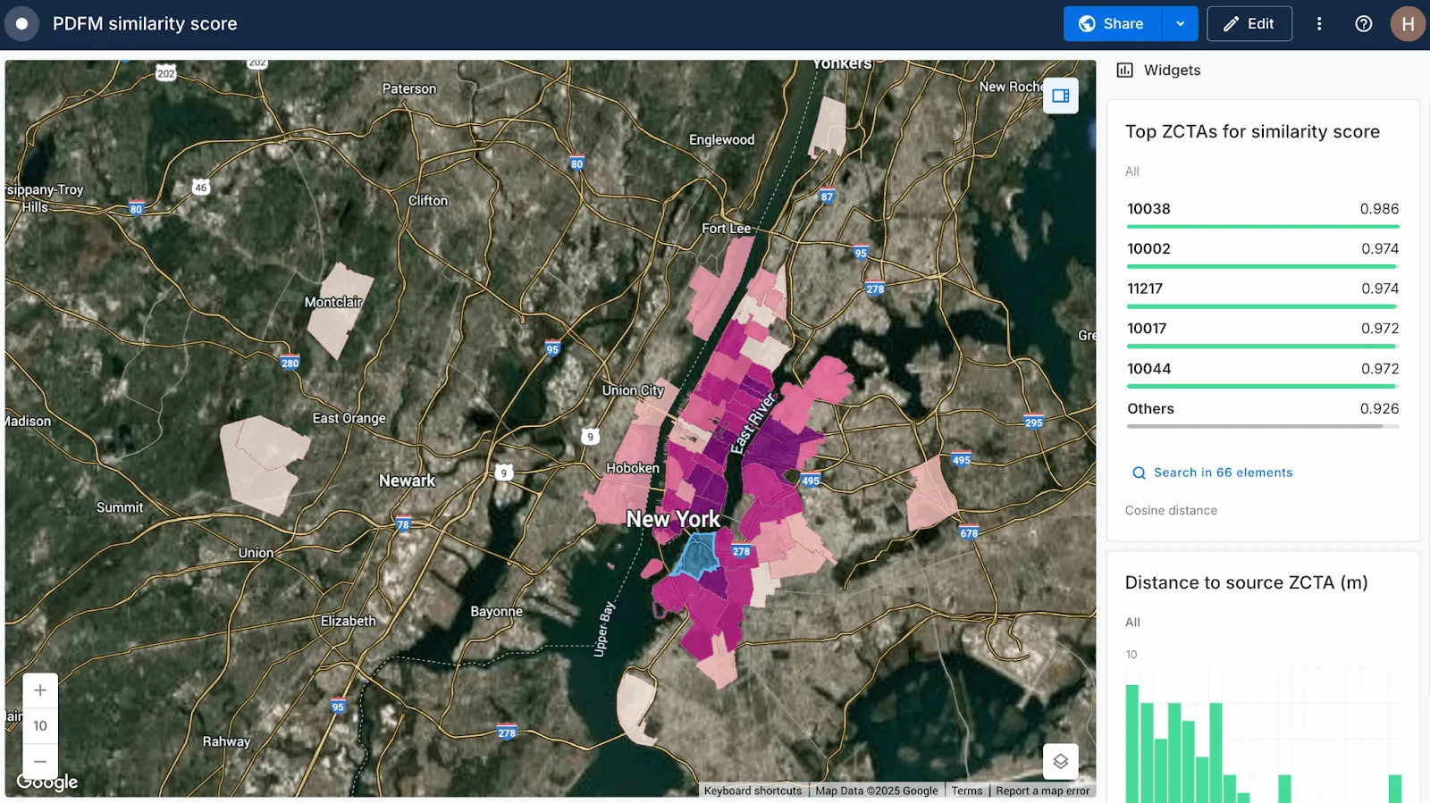 Using PDFM embeddings in CARTO Workflows (see above), we identified a high-performing ZIP Code (11201, Williamsburg, NYC) and calculated the cosine similarity (a measure of how closely areas resemble each other) of every other ZIP Code. The result: a list of the 100 top ‘lookalike’ areas to replicate campaign success.