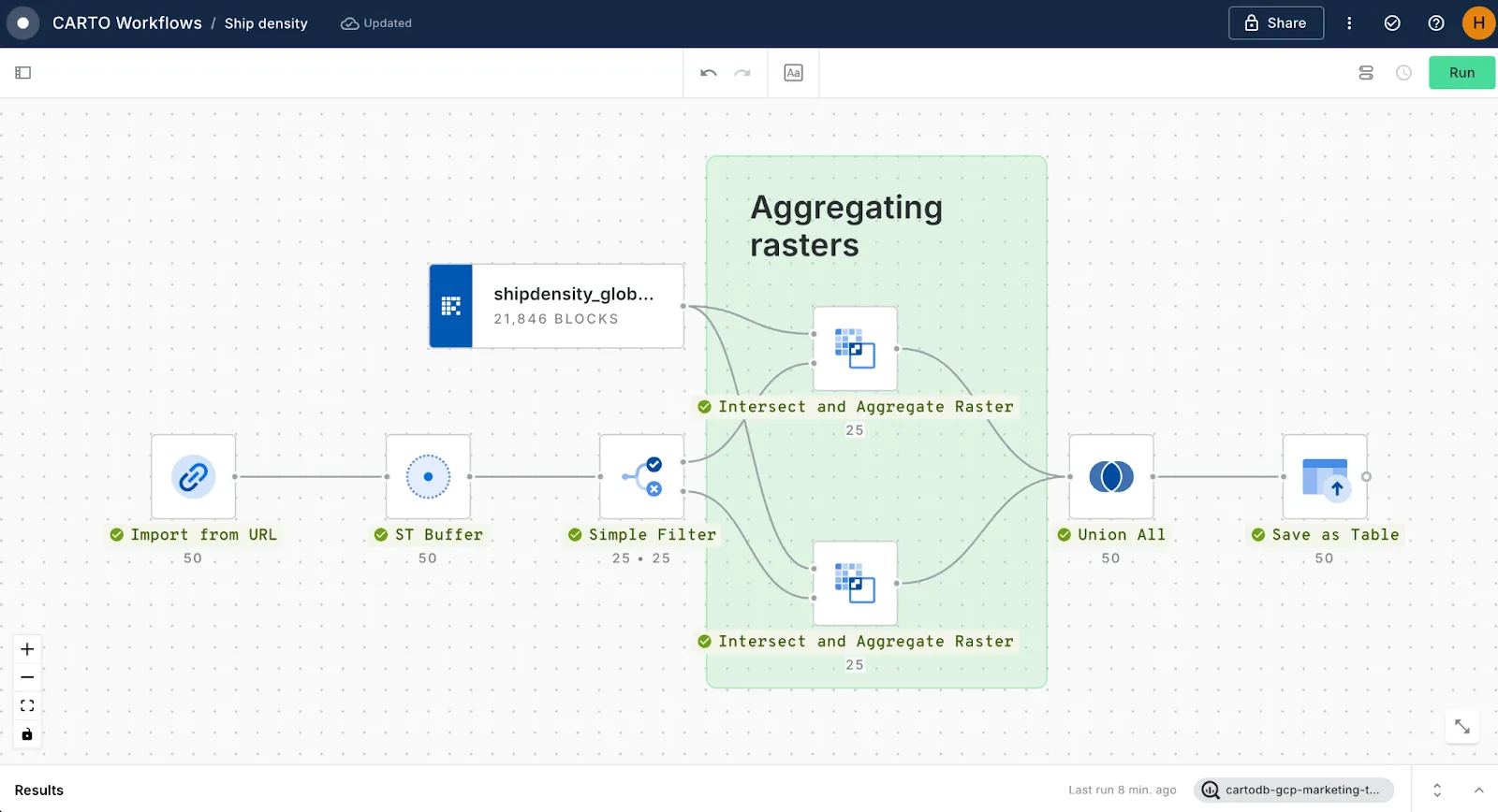 Leveraging CARTO Workflows for raster analysis- In the CARTO Workspace, head to the** Workflows** tab.** Create a new workflow** through whichever connection you uploaded your shipping density data to. Our end-result workflow will end up looking something like this:- In the** Connections** tab, navigate to where you saved your raster data, and simply drag it onto the canvas. - Next, we need to bring our port location data into the workflow; in this case we’ve accessed this via an** Import from URLcomponent - which you can find in the ** Components tab. This component is sourcing data from this Google Sheet. Note your Workflow needs to be immediately run after using this specific component. - We want to create a search area of 1,000 meters around each port, which we’ll use to calculate both the average and maximum shipping density. Connect the Import from URL component to an** ST Buffer** component with a distance of 1000 meters.- Our shipping density raster is - well - massive! It covers the whole world with a resolution of 500 meters. Because of this, we’ll need to break the ports table into two subsets to run the next section of the analysis. Connect your buffer to a** Simple Filter** component, with the condition that the rank is equal or less than 25. Run your workflow here. - Now, time to calculate shipping density! Drag anIntersect and Aggregate Raster component onto the canvas. Connect the shipping density raster to the top input, and the top (positive) output of the filter to the bottom input. Here, you can choose the input bands and aggregation types - we’ll use band 1 (shipping density) and both an average and maximum aggregation type.