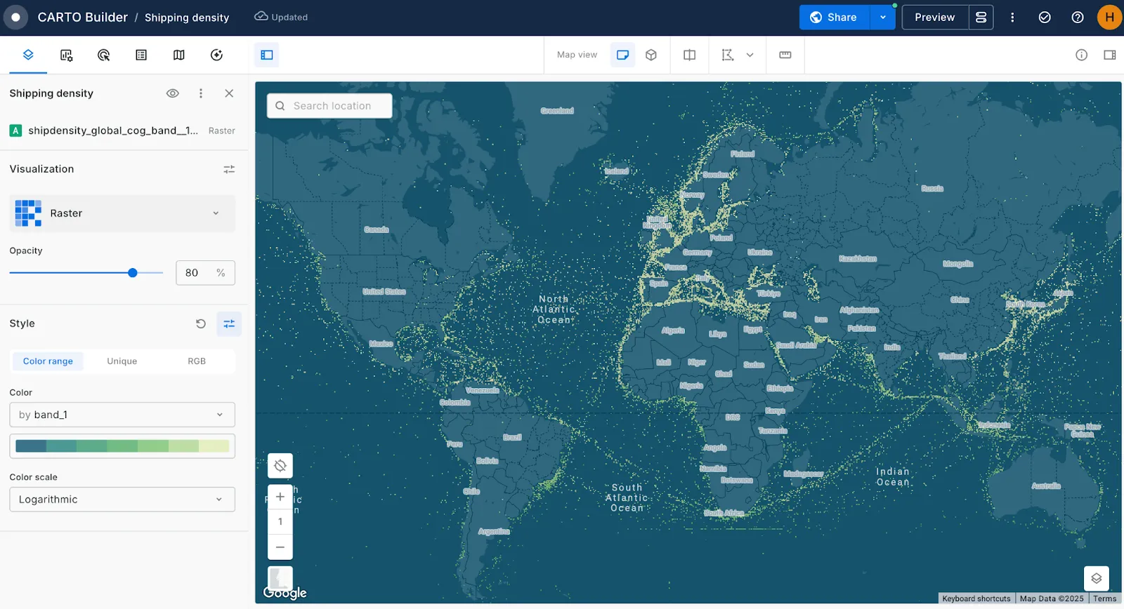 Here’s how we’ve used these powerful capabilities for our example! In addition to creating a stunning map with the massive ship density raster, we’ve overlaid this with the results of our analysis from earlier. Additionally, we’ve added a series of interactive widgets and pop-ups. This allows users to easily pinpoint the ports - such as Hamburg, Rotterdam and Ningbo-Zhoushan - which have the highest shipping density, helping them to prioritise actions to mitigate supply chain and investment risk.