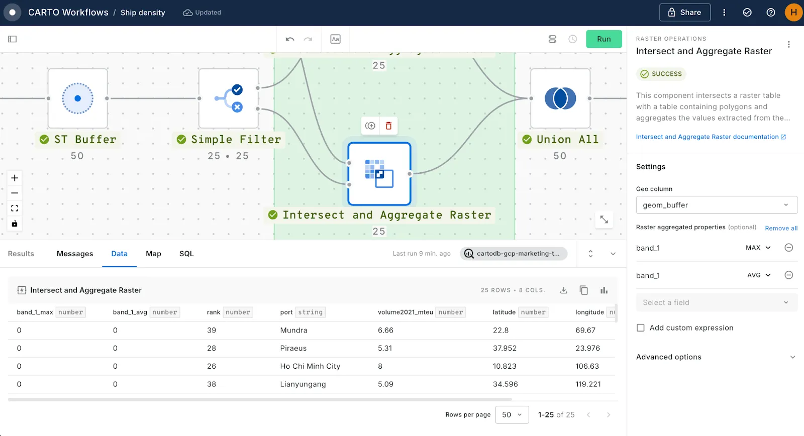 Intersecting & aggregating data from a raster- Repeat this with a second** Intersect and Aggregate Raster**, this time using the bottom (negative) output of the filter for the bottom input. This will repeat the aggregation process for the second half of the ports table.- Run the workflow! You should see that each of your Intersect and Aggregate components now have a band_1_max and band_1_avg field. Now let’s bring them together - connect both to a** Union All** component to re-merge the two halves of our analysis, then finally connect this to a** Save as Table** component… now we’re ready to make a map!