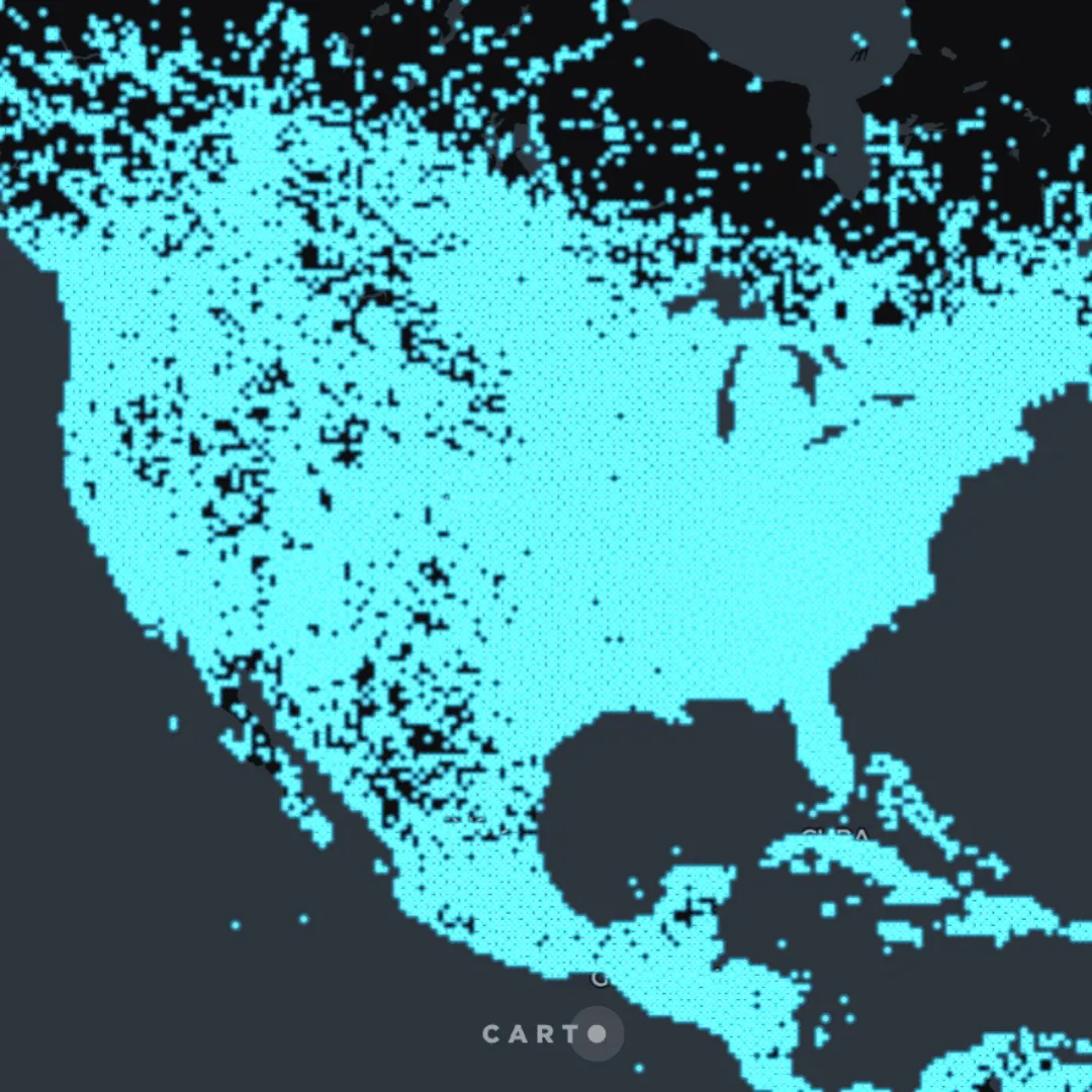[](https://clausa.app.carto.com/map/2afbd71b-e8f3-457d-95d4-e722eb894c89?lat=0.000000&lng=-1.829150&zoom=1) Click [here](https://clausa.app.carto.com/map/2afbd71b-e8f3-457d-95d4-e722eb894c89?lat=0.000000&lng=-1.829150&zoom=1) to interact with this map visualization with 482M points using a pre-generated tileset in BigQuery.Pushdown analytics with extended geospatial support