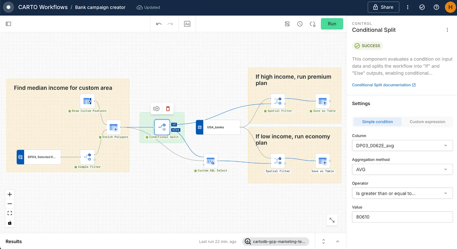 Spatial workflows rarely follow a single straight path - data quality, thresholds, or service availability can all demand different actions. To make workflows more resilient, CARTO now includes two new control components:** Conditional Split**, which lets you branch a process based on rules you define (e.g. only run a fiber expansion workflow if underserved households exceed 500), and** Success/Error Split**, which adapts automatically depending on whether the previous step succeeds or fails (e.g. trigger a fallback geocoder if the first one fails).