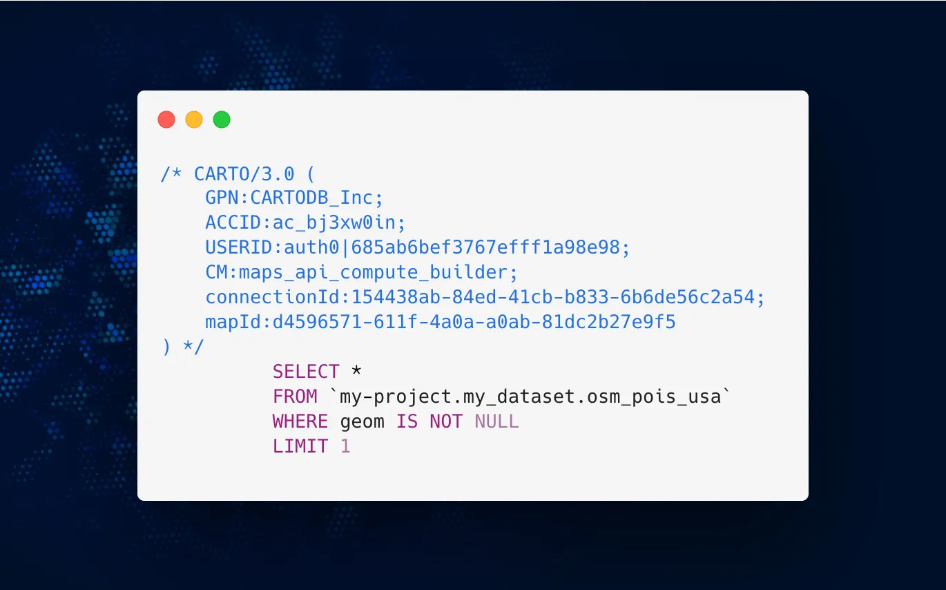 For administrators, visibility into query activity is critical for cost management, performance monitoring, and compliance. CARTO now appends audit trails to every SQL query it runs, identifying the map, workflow, or process behind it. This transparency helps admins answer key questions, spot trends, and govern spatial workloads with confidence. Learn how to audit your SQL queries with CARTO here.
