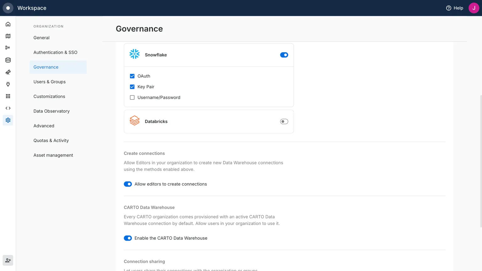 Governance settings in the CARTO Workspace