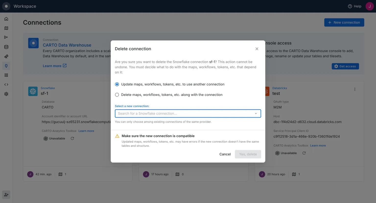 Deleting connections in the CARTO Workspace