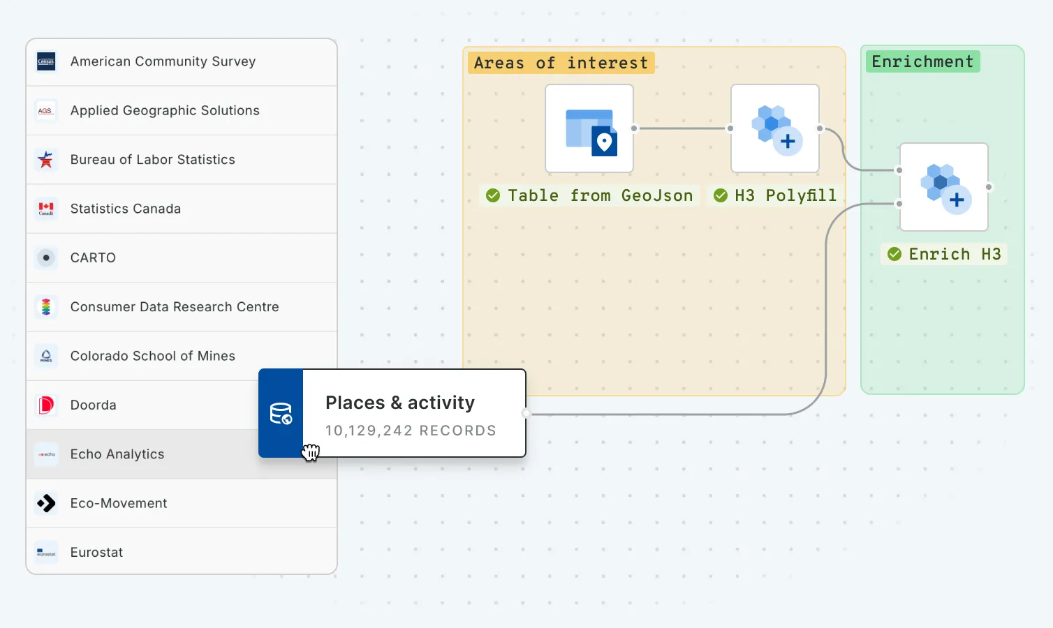 We use the native data-sharing capabilities of cloud data warehouse platforms to grant you access to your subscribed data. In such a way, you can then use your subscriptions in CARTO via the same native connections you have established between our platform and your data warehouse.