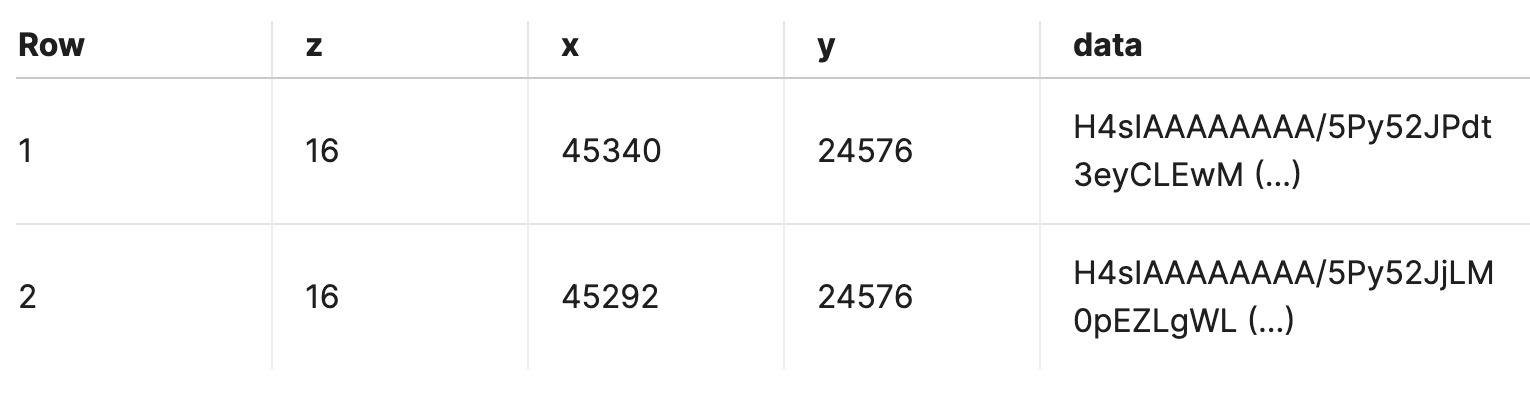 The generated map tiles are stored in a table within the cloud data warehouse in GeoJSON format. Each tile is stored as a row in this table, with columns containing the tile coordinates and the corresponding spatial data.