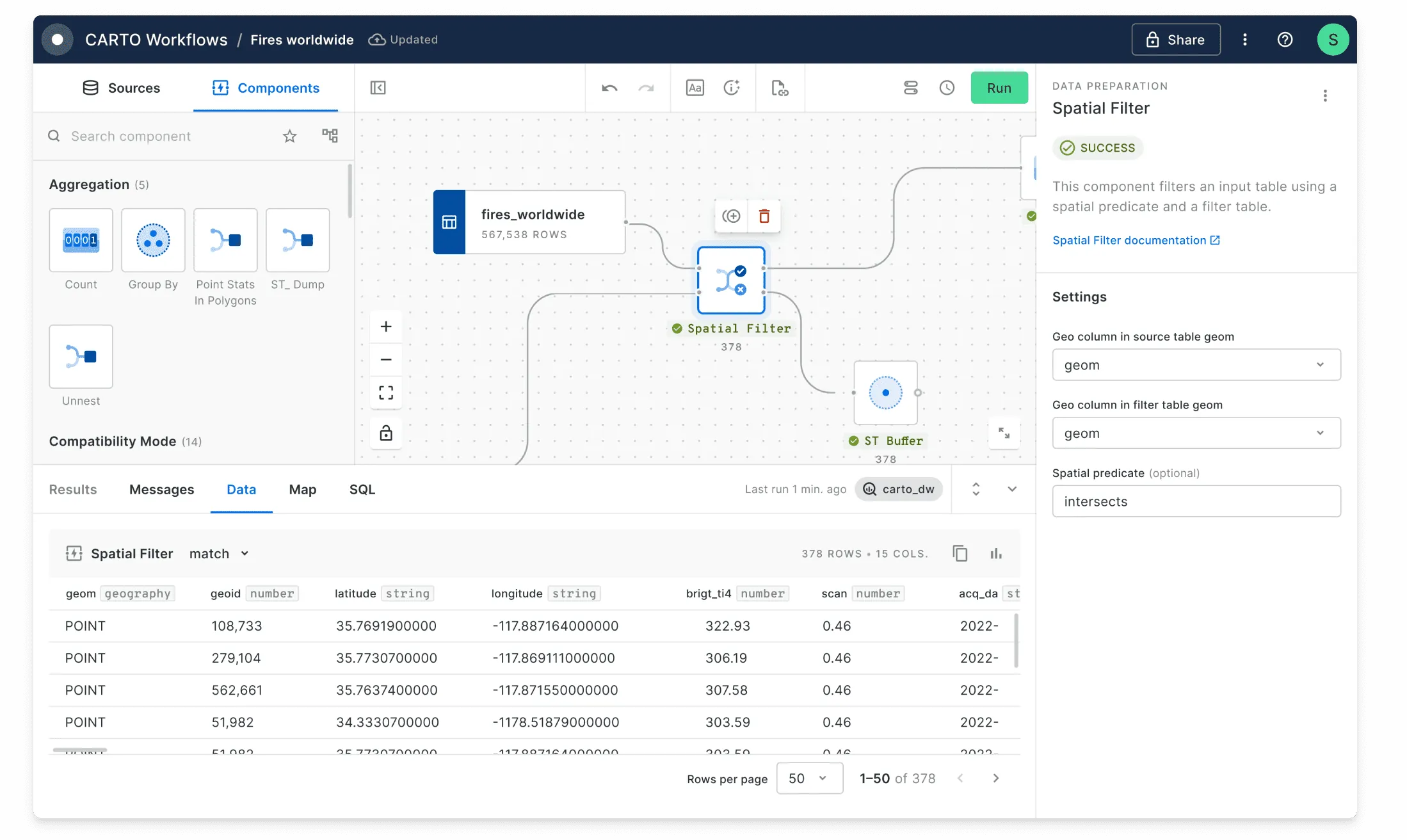 If you’re already familiar with SQL, Spatial SQL is a natural next step. It uses many of the same commands and syntax - just with spatial-specific functions like ST_Intersects, ST_Distance, or ST_Buffer. Many platforms also offer visual low-code tools - like CARTO Workflows - to help you leverage Spatial SQL functions, but without writing code.